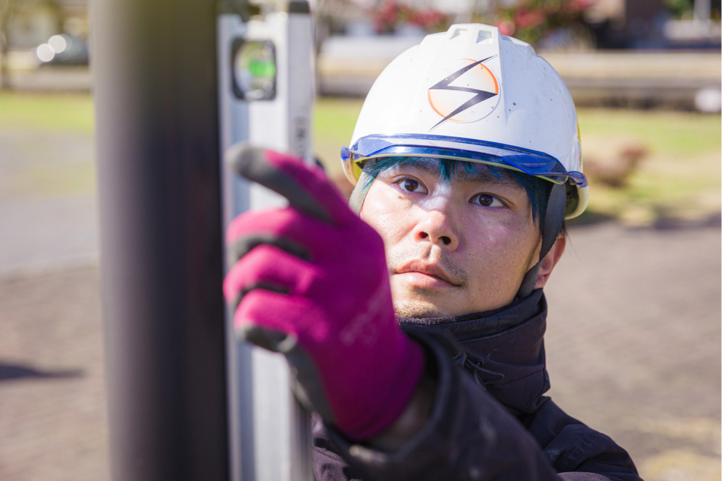 現在は、仮設電気工事、引込工事、公共工事(照明関係)、公園の電気工事などを担当しています。